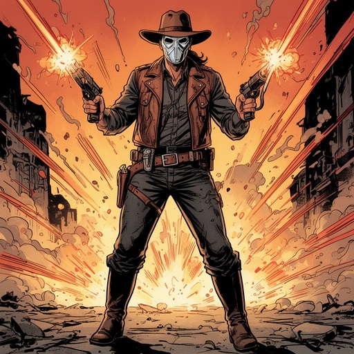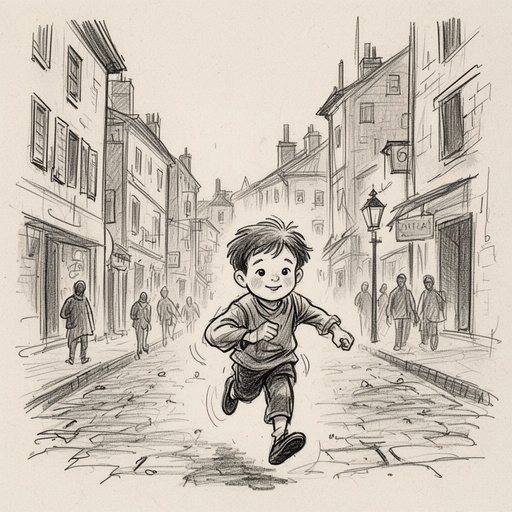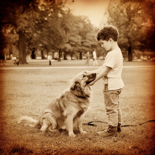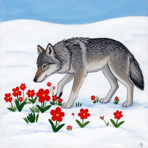 A boy in a blue coat and a wolf standing face-to-face in an open outdoor space with a forest in the background