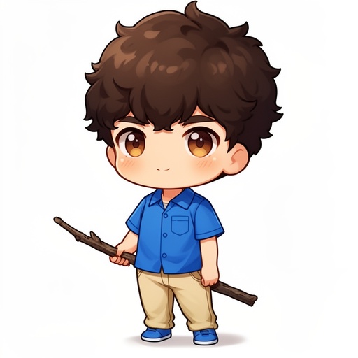 A boy with stylish dark brown hair and a honey skin complexion wearing a blue short-sleeved collar shirt, beige pants, a...