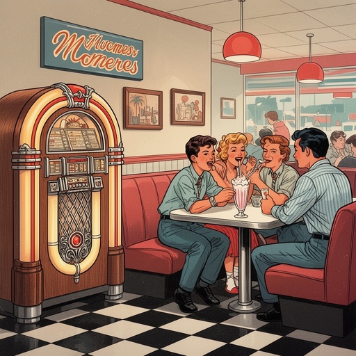 A 1950s diner scene with a jukebox, checkered floor, and teenagers sharing a milkshake