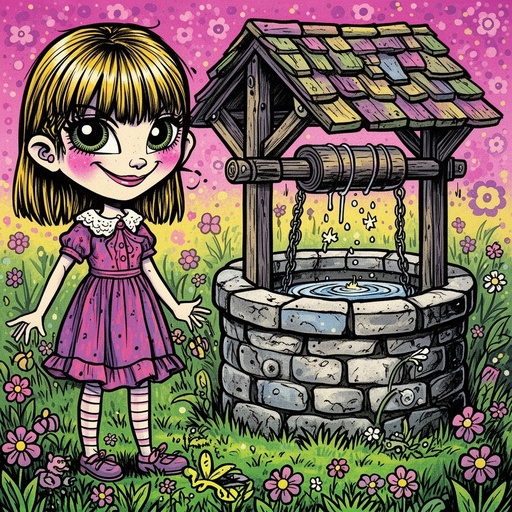 A girl with a pink flower in her purple hair and cute, expressive eyes wearing a sleeveless, multicolored dress that rea...