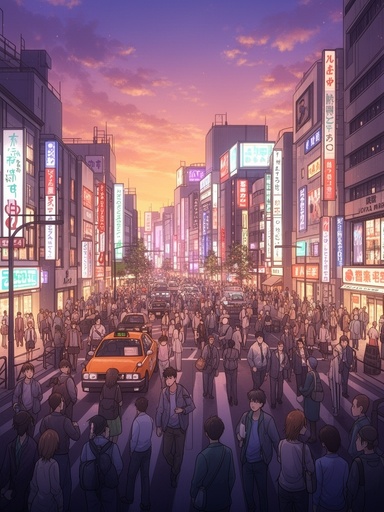 A distorted cityscape with exaggerated angles and harsh colors conveying anxiety and chaos