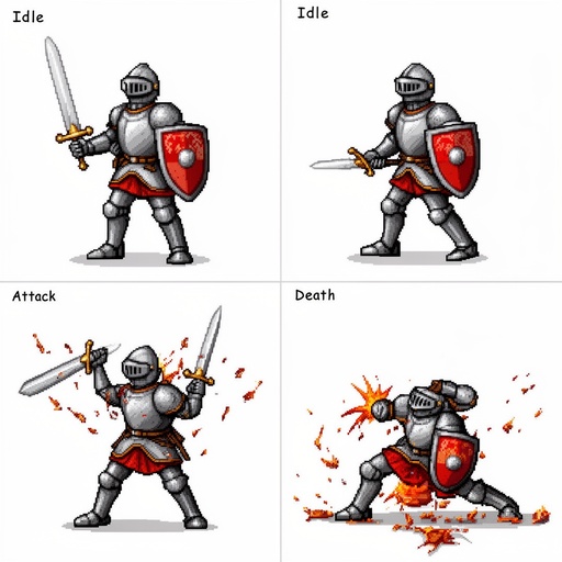 A knight character with sword and shield showing idle, walk, attack, and death animation frames