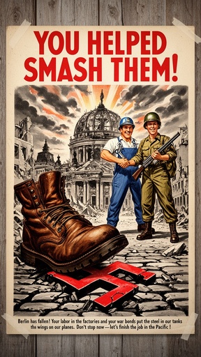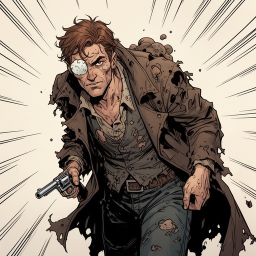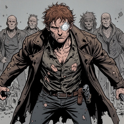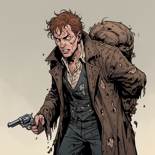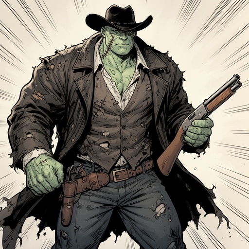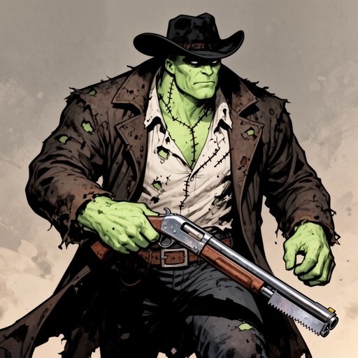 A young girl with long lavender purple hair wearing a brown coat over dark green clothing, light gray pants, and brown b...