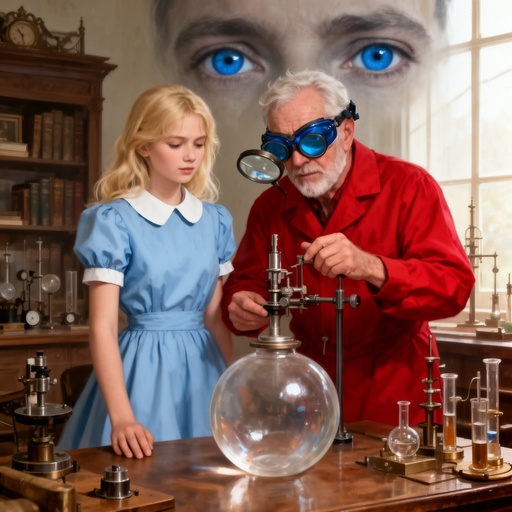 An elderly witch with wildly untidy white hair wearing a dark red sleeveless dress and a silver necklace with a small wh...
