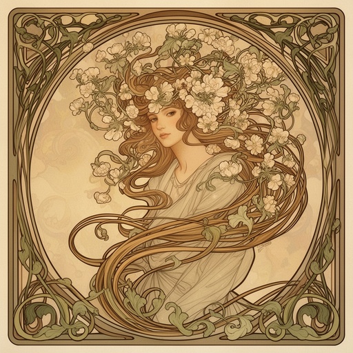 A woman with flowing hair transforming into blooming flowers and organic vine patterns