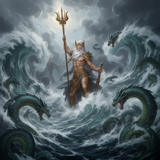 Poseidon rising from a stormy sea, trident raised, surrounded by sea serpents and massive waves