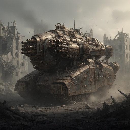 A massive war machine with exposed engines and riveted armor plating rolling through a bombed city