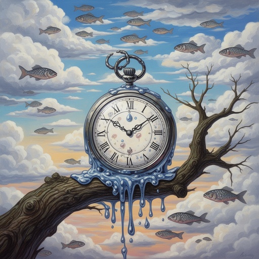A giant pocket watch melting over a tree branch while fish swim through clouds in the sky