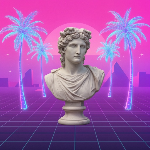 A Greek statue bust surrounded by palm trees, geometric shapes, and pink/purple sunset gradients