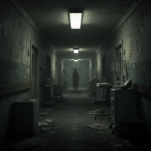 A abandoned hospital hallway with flickering lights, a shadowy figure at the far end, medical equipment scattered