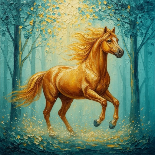 A radiant horse leaping through shimmering woods, golden mane flowing with joy, teal trees echoing calm. Oil paint, heav...