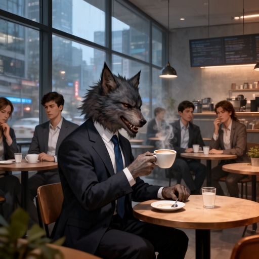 A werewolf in a business suit having coffee at a modern café next to oblivious human customers