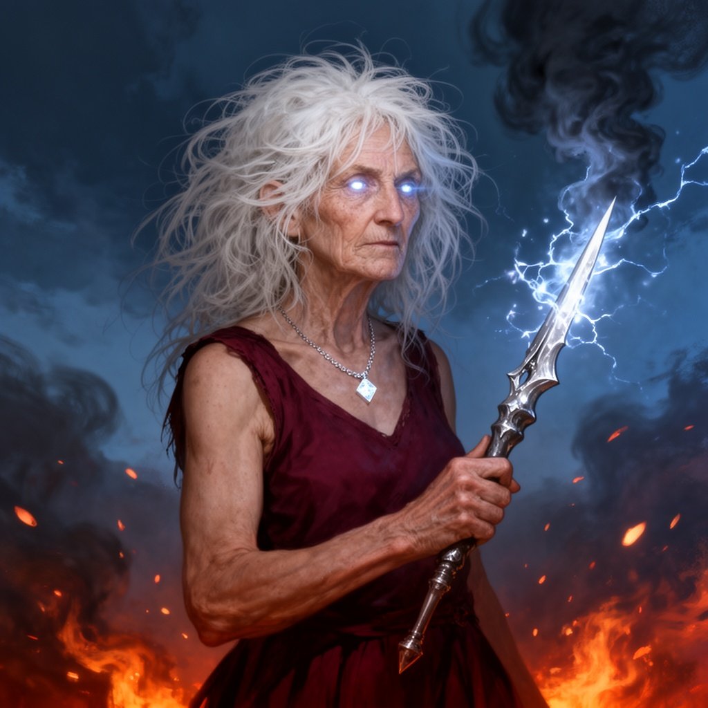 An elderly witch with wildly untidy white hair wearing a dark red sleeveless dress and a silver necklace with a small white diamond, and she is holding a silver, blade-like wand. The background is a sky in dark shades of blue and indigo with smoke rising and fire embers flying behind her.