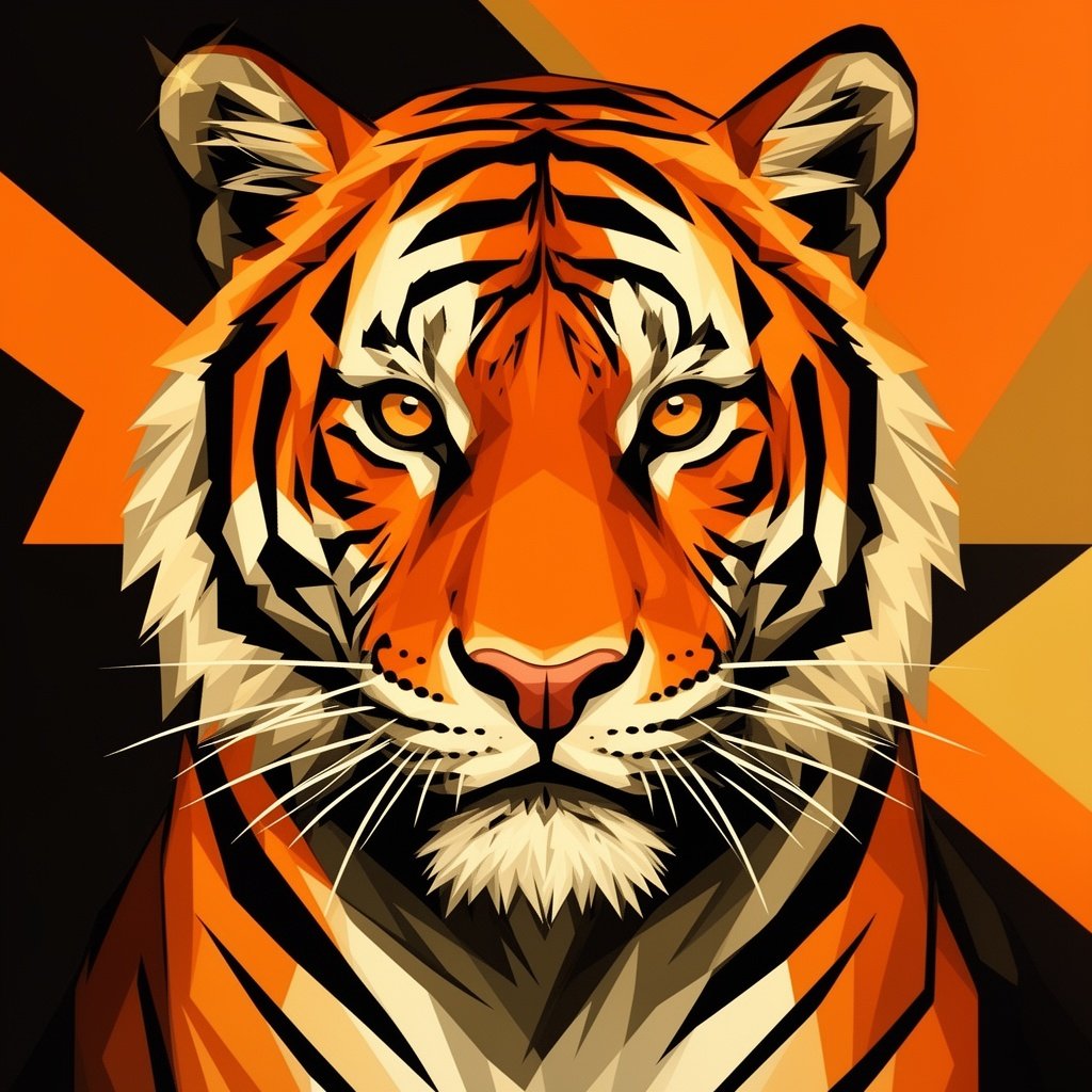 A fierce tiger portrait with bold geometric shapes and vibrant orange, black, and gold color scheme