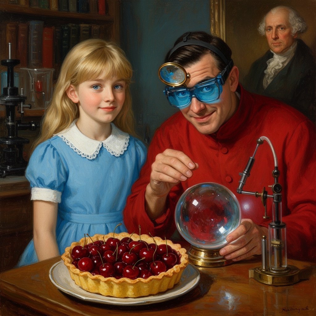 Kandinsky 2.2 a hyperrealistic, 8K resolution, cinematic lighting, shot on 35mm lens, f/1.8, high contrast, crisp, clear, no blur, photorealistic, intricate detail, texture, 8k, RTX on, dramatic studio lighting sharp focus, cosmic symbolist and ultra-mysterious and mystical and hyper Neo-surrealist moody painting in the style of nicole clavloux,A magic realism, cosmic symbolist and ultra-mysterious and mystical and hyper Neo-surrealist moody painting in the style of Andrew Wyeth, Hieronymus Bosch, Pieter Bruegel the Elder, Benozzo Gozzoli, Agostino Arrivabene, Rob Dave McKean, Easo Andrew’s, Umberto boccioni,Nicole clavloux, victor moscoso, rachaet mcclean, Aires moross, Alberto seveso, a very young man wearing X-ray specs fortune teller with a crystal ball stares into it with raised eyebrows and A decadent cherry tart done in a Rene Magritte surreal style , rendered in an impressionist style with soft brushstrokes and vivid, expressive colors, capturing a contemplative incredible blue eyes and introspective mood, smiling at the camera, 1950s or 1960s style, studio with bold colors A blonde with long hair teenage girl 15 years old wearing an Alice blue dress with a white linen Peter Pan collar, stands beside an older man in a red outfit. The man wears blue-tinted goggles with a head mirror, adjusting a scientific instrument over a clear spherical object. Both are in a vintage, well-lit room filled with scientific equipment and books. A portrait of an older gentleman in classical attire is visible in the background, observing the scene intentl