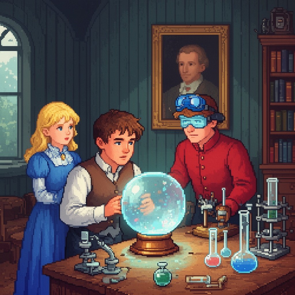 Kandinsky2.2 a hyperrealistic, 8K resolution, cinematic lighting, shot on 35mm lens, f/1.8, high contrast, crisp, clear, no blur, photorealistic, intricate detail, texture, 8k, RTX on, dramatic studio lighting sharp focus, cosmic symbolist and ultra-mysterious and mystical and hyper Neo-surrealist moody painting in the style of nicole clavloux,A magic realism, cosmic symbolist and ultra-mysterious and mystical and hyper Neo-surrealist moody painting in the style of Andrew Wyeth, Hieronymus Bosch, Pieter Bruegel the Elder, Benozzo Gozzoli, Agostino Arrivabene, Rob Dave McKean, Easo Andrew’s, Umberto boccioni,Nicole clavloux, victor moscoso, Lou Brooks,Neon Park,MicHaggerty,a young man wearing X-ray specs fortune teller with a crystal ball stares into it with raised eyebrows and A decadent cherry tart done in a Rene Magritte surreal style , rendered in an impressionist style with soft brushstrokes and vivid, expressive colors, capturing a contemplative incredible blue eyes and introspective mood, smiling at the camera, 1950s or 1960s style, studio with bold colors A blonde with long hair teenage girl 15 years old wearing an Alice blue dress with a white linen Peter Pan collar, stands beside an older man in a red outfit. The man wears blue-tinted goggles with a head mirror, adjusting a scientific instrument over a clear spherical object. Both are in a vintage, well-lit room filled with scientific equipment and books. A portrait of an younger gentleman in classical attire is visible in the background, observing the scene intently. There is a sense of curiosity and experimentation, with a blend of fantasy and scientific exploration.