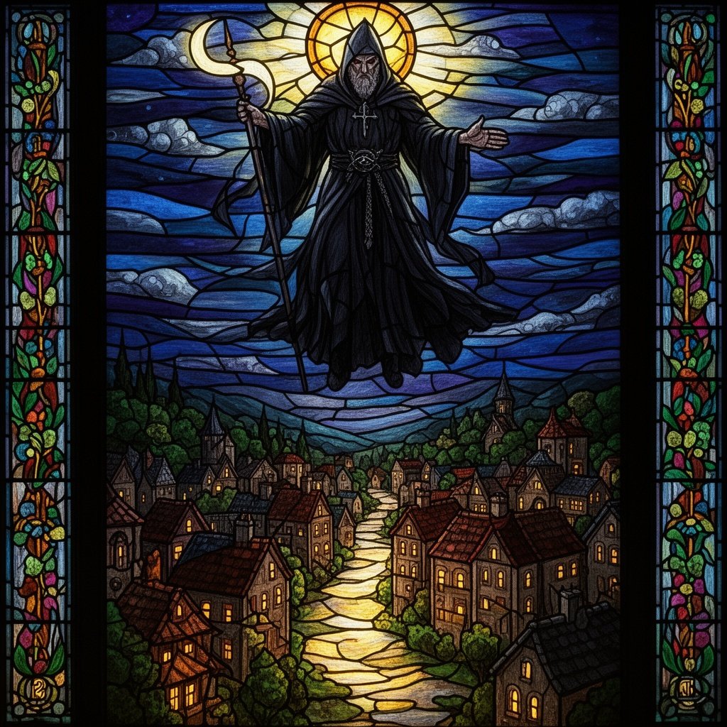 A bald man with bluish white skin wearing a brown robe and standing on top of a tall rock in a world with yellow storm c...