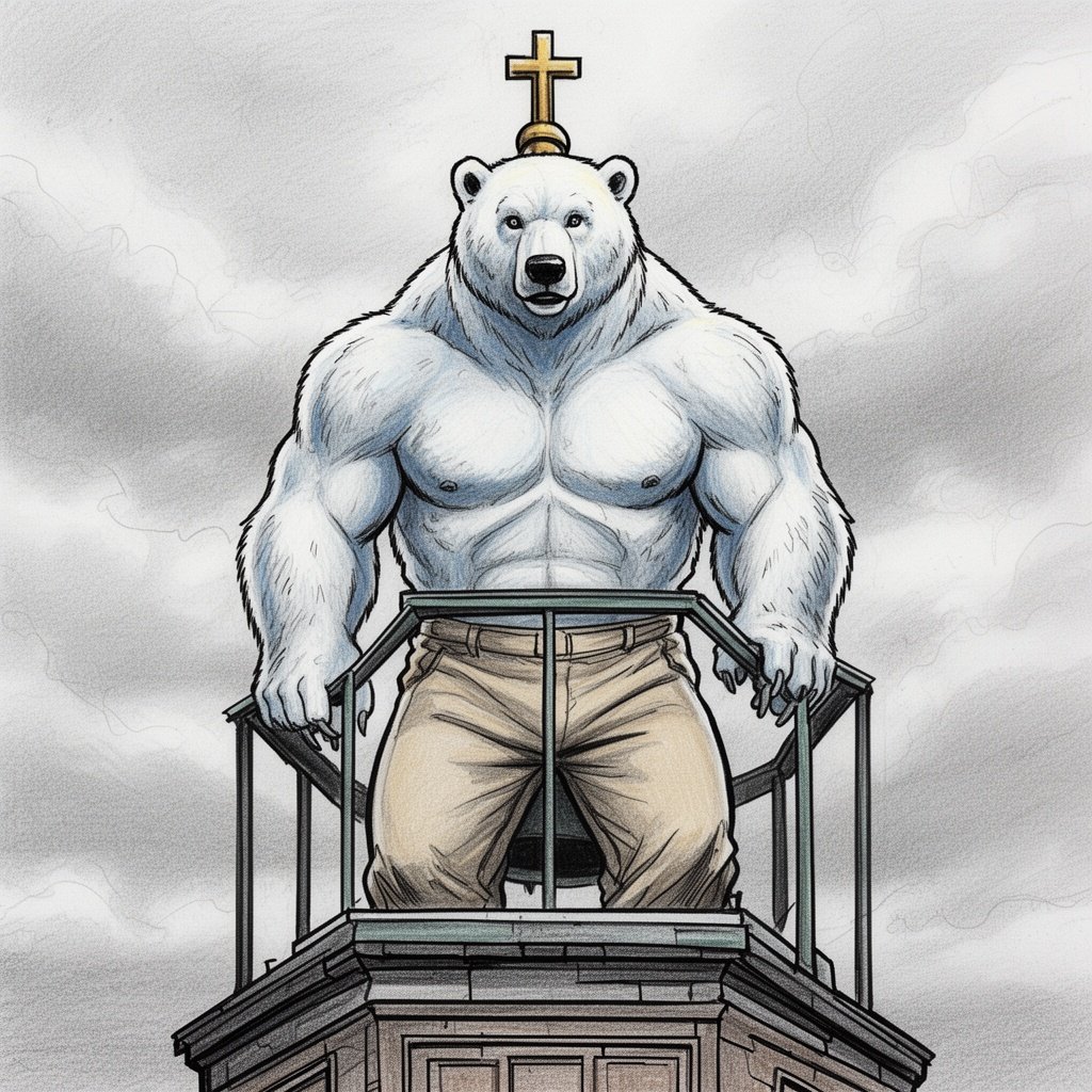 A big, muscular, humanoid polar bear wearing beige pants and standing inside the top of a bell tower, and the sky is overcast