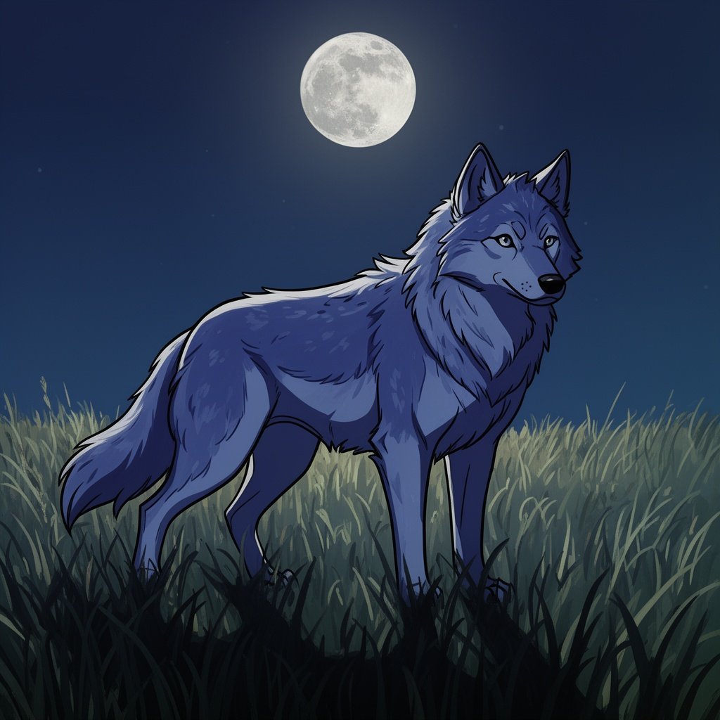 A wolf with indigo fur standing in a meadow of long grass under a full moon at night