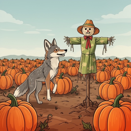 A coyote finding a scarecrow in a pumpkin patch