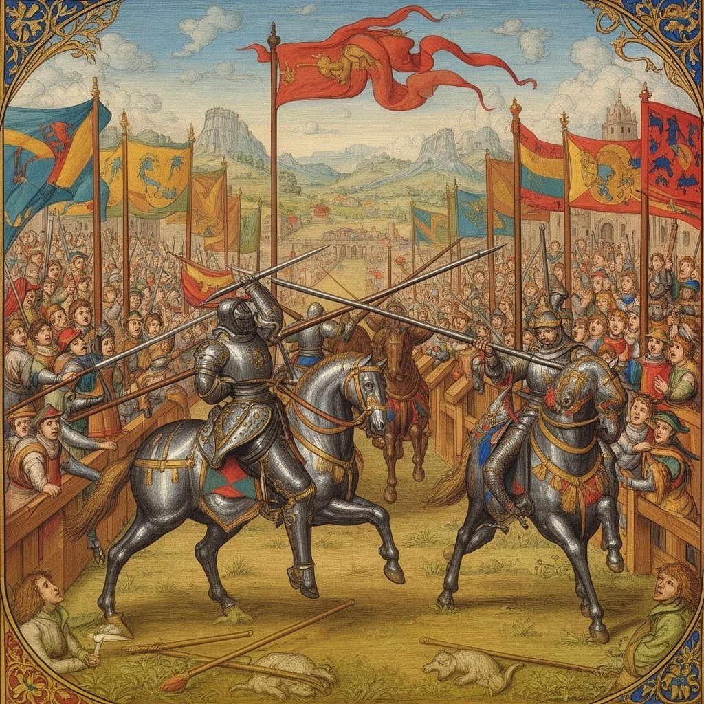 A jousting tournament with knights in gleaming armor, colorful banners, and cheering crowds