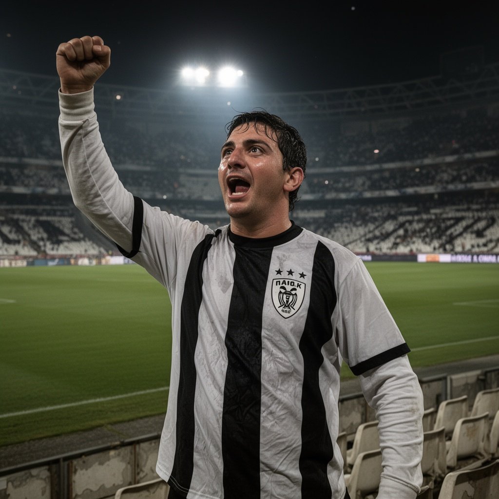 φτιαξε μου μια εικονα ενος φιλαθλου να πανηγυριζει μεσα σε ενα γηπεδο ειναι οπαδος του ΠΑΟΚ με ασπρομαυρα και βρισκεται ...