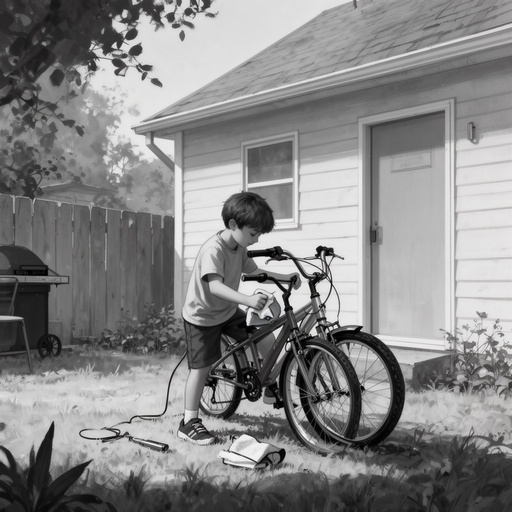 A boy cleaning his bike in the backyard of a house