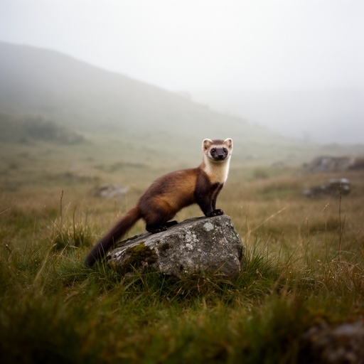 A pine marten on a rock in a grassy valley