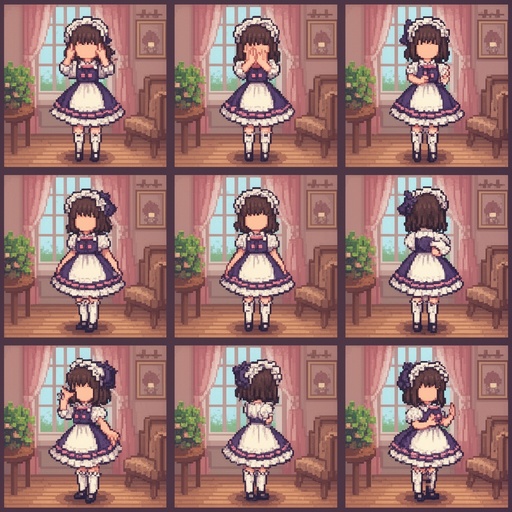 帮我生成图片:写实摄影风格,一位穿着洛丽塔的美女在室内的9张照片,要求姿势表现不同,她完全遮挡住五官,着重突出夸张的长腿、丰满上围、纤细腰部和下腹部,身材比例夸张。室内打光不均匀,有轻微曝光的情况。采用随手一拍的视角,构图表现为自然的仰拍,...