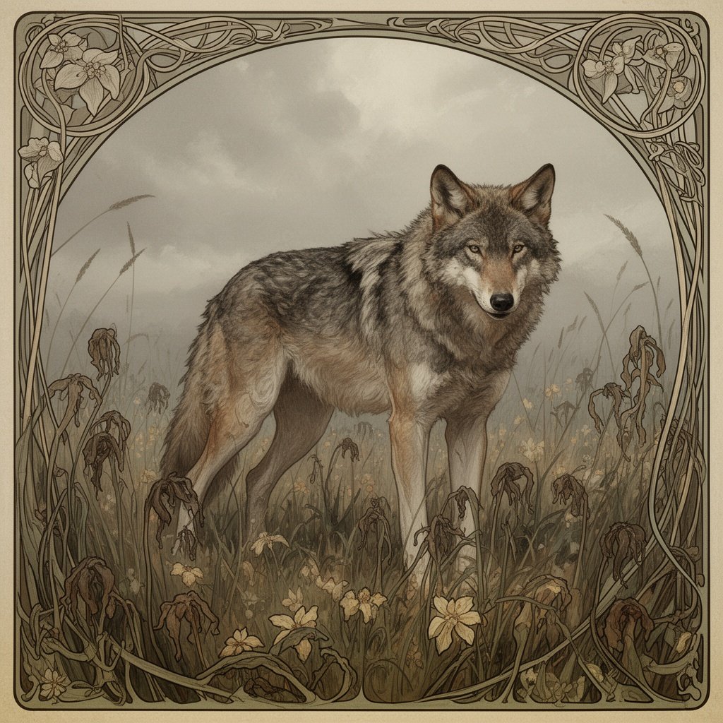 A wolf standing in a meadow of decaying grass and flowers under an overcast sky