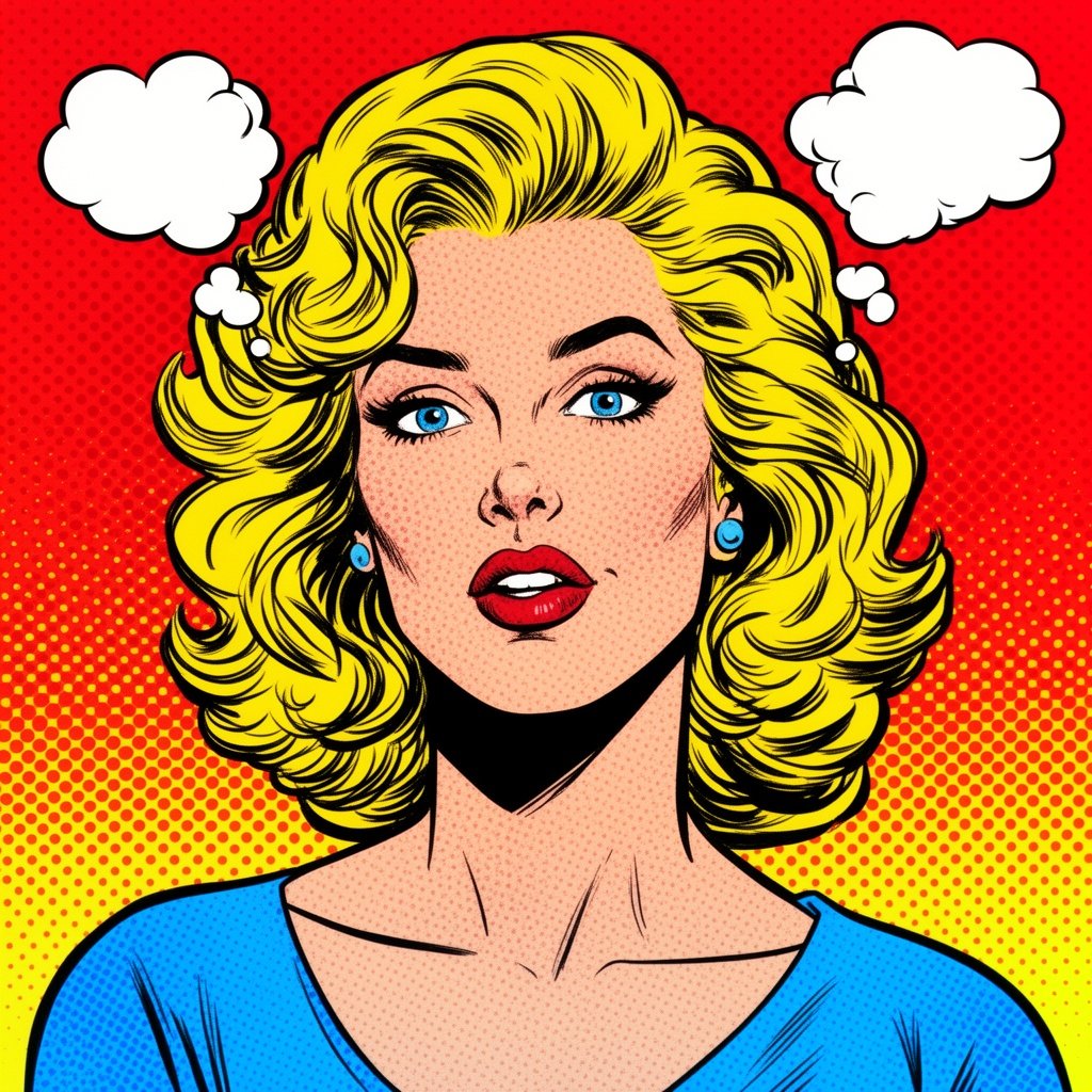 A bold portrait of a woman with comic-style dots, primary colors, and thought bubbles