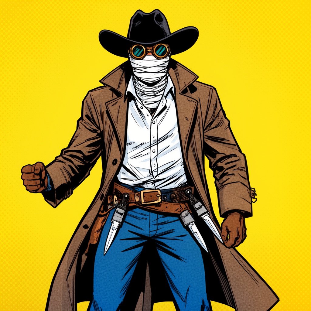 the character is defined by his clothing, which creates a humanoid shape with no visible skin or head. Clothing: A long duster, white shirt, and a black cowboy hat. Can be shown with bandages around his face while wearing goggles if it looks better to the photo. Weapon: Two visible throwing knives hung at his waist