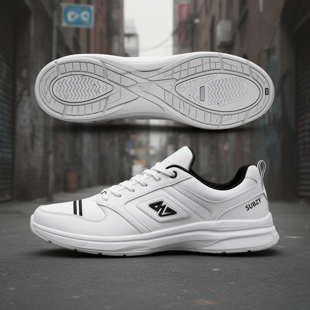 <<couleur blanche Type : hybride Semelle : urbaine Présence du logo sur le côté tel que tu l’as oui mais à la place du logo S encerclé tu mets plutôt SZ en majuscule Sensation premium street Le bout de l’avant de la basket du mets deux barres quittant les bords des lacets jusqu’en avant de la paire , pour le coté tu mets SUBZY , pour la semelle tu reproduis le début. de L’intérieur de la paire doit être noire. Tu me donnes des images de face et de profil>> c’est l’idée generale c’est une paire du quotidien très mode solide et urbain. Vas y donne un croquis