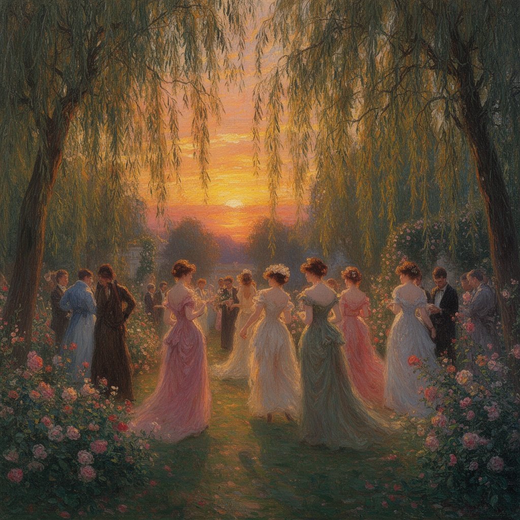 A garden party at sunset with ladies in flowing dresses, dappled light through willow trees