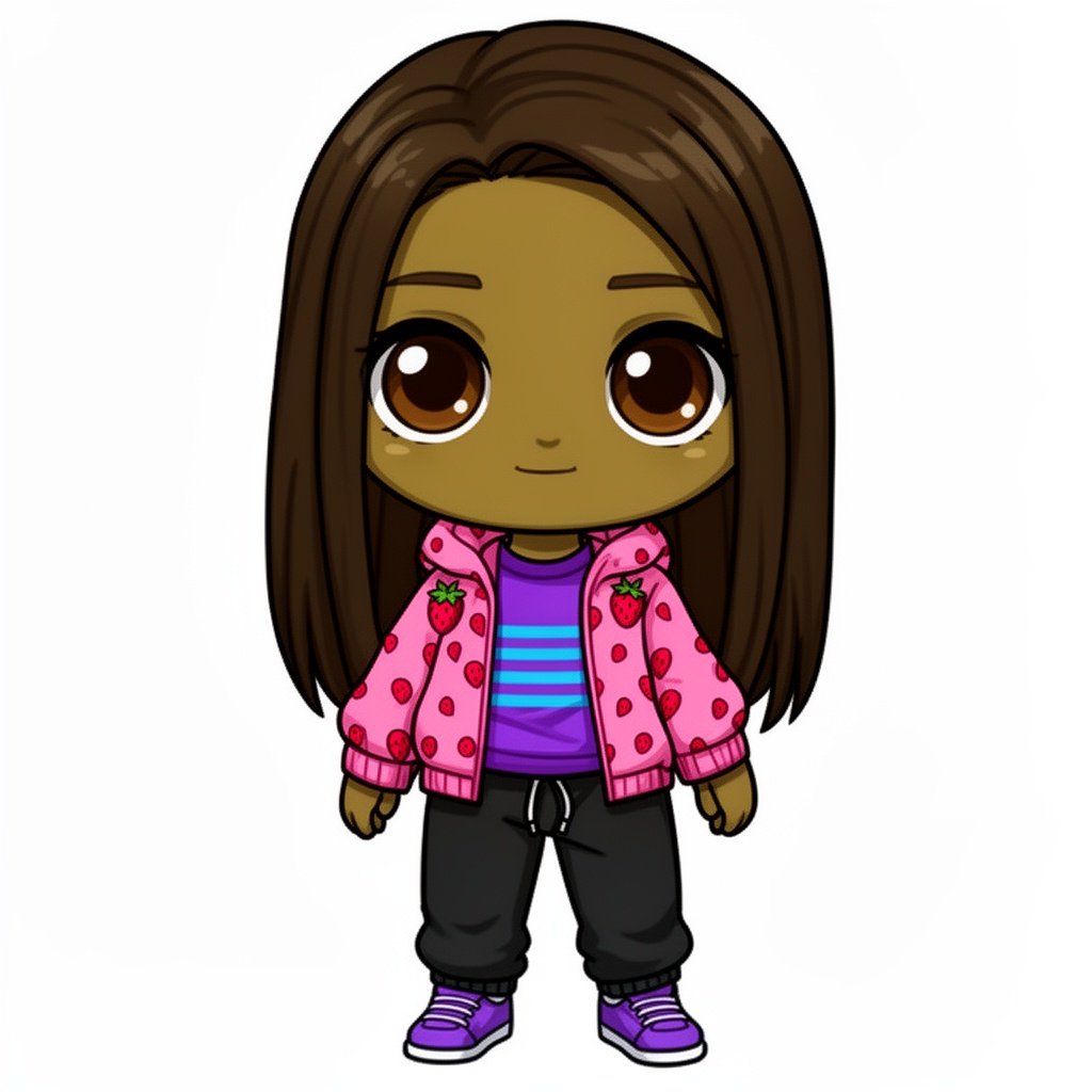 A girl with olive brown skin, long, straight dark brown hair, and expressive brown eyes wearing a strawberry pink jacket over a purple shirt with cerulean blue stripes, black sweatpants, and purple shoes