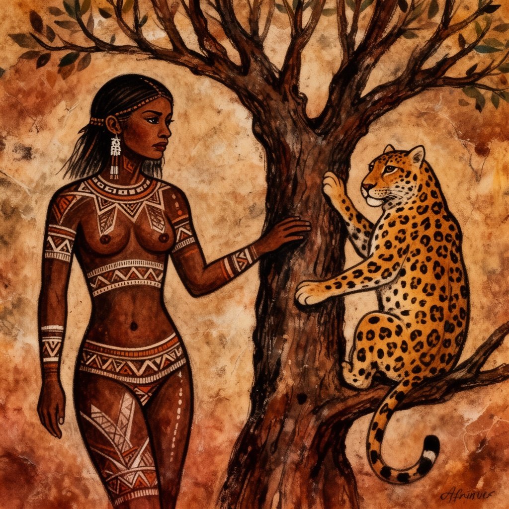 A woman standing near a tree with a leopard in it