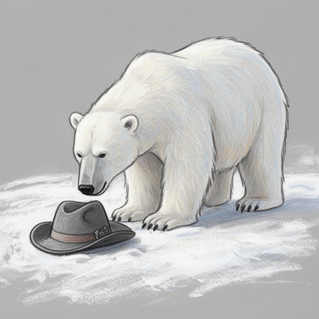 A polar bear finding a hat on a snowy ground