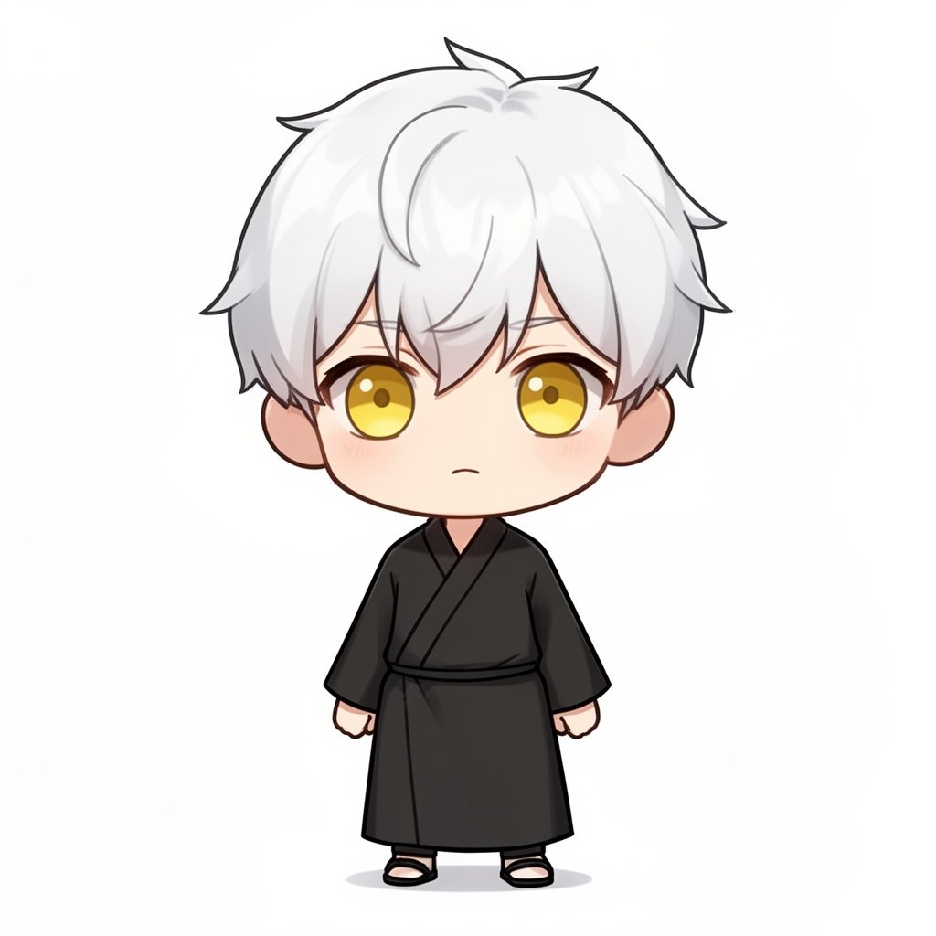 A boy with fair skin, eyes with a yellow iris, and white hair wearing a black robe