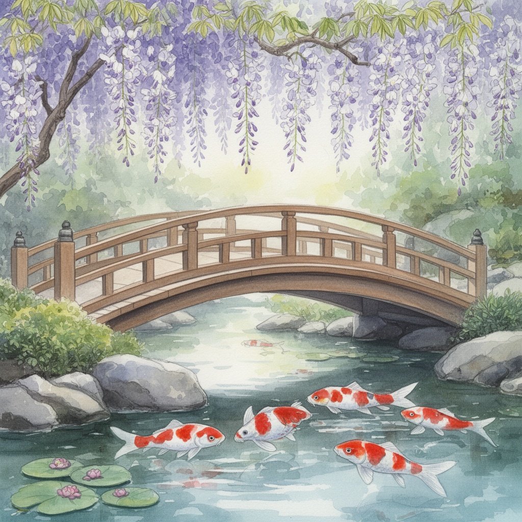 A serene Japanese garden with koi fish swimming beneath a curved wooden bridge, wisteria hanging overhead