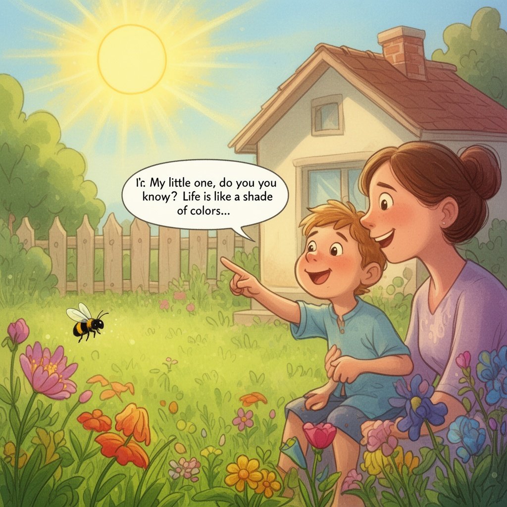 Era un día soleado, con un sol radiante iluminando el pequeño jardín de una humilde casa. Allí, una madre y su hijo compartían un momento de alegría. El niño, lleno de curiosidad, observaba todo a su alrededor, maravillado por la belleza del jardín. -Mami, mami, mira esa abeja, es muy tierna -dijo Peter con una sonrisa, señalando una abeja que revoloteaba cerca de una flor. -Sí, mi pequeño, es hermosa -respondió su madre, aunque su mente seguía atrapada en una visión que había tenido momentos antes. Después de un instante, su madre lo miró y le dijo con ternura: -Mi pequeño, ¿sabes? La vida es como un matiz de colores.