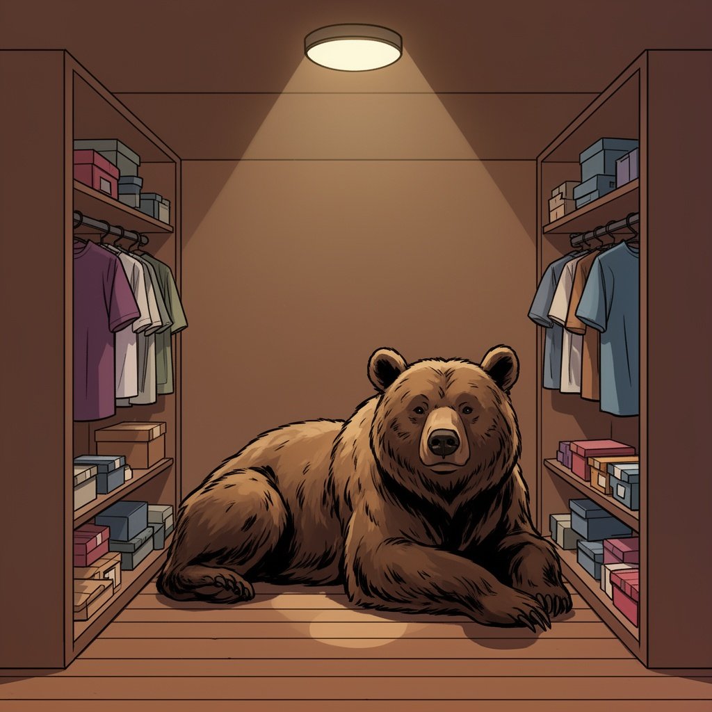 A grizzly bear lying down in a closet that is full of small boxes and clothes and has brown walls and a lit ceiling ligh...