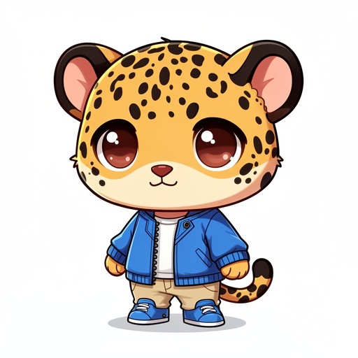 A jaguar cub wearing a blue jacket, beige pants, and blue shoes