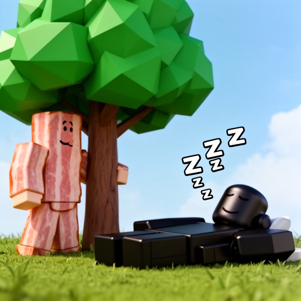 je veut un personnage roblox qui et un skin bacon qui se cache derrière un arbre en espionnent un skin sammy sur roblox qui dort avec des icon zzz