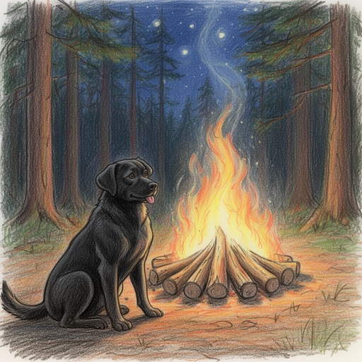 A big dog with pointed ears and dark blue fur drinking from a bright lake in a mystical land