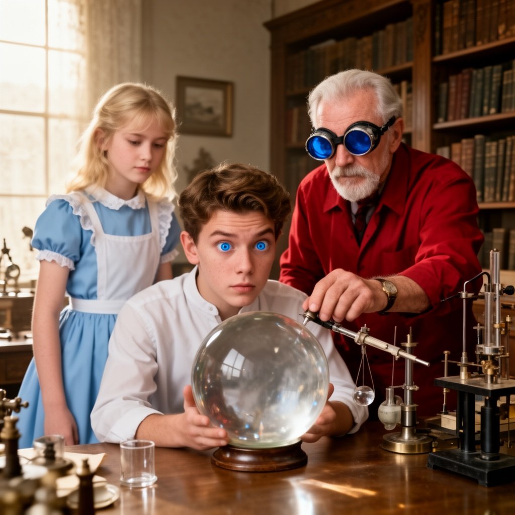 Kandinsky 2.2 a hyperrealistic, 8K resolution, cinematic lighting, shot on 35mm lens, f/1.8, high contrast, crisp, clear, no blur, photorealistic, intricate detail, texture, 8k, RTX on, dramatic studio lighting sharp focus, cosmic symbolist and ultra-mysterious and mystical and hyper Neo-surrealist moody painting in the style of nicole clavloux,A magic realism, cosmic symbolist and ultra-mysterious and mystical and hyper Neo-surrealist moody painting in the style of Andrew Wyeth, Hieronymus Bosch, Pieter Bruegel the Elder, Benozzo Gozzoli, Agostino Arrivabene, Rob Dave McKean, Easo  Andrew’s, Umberto boccioni,Nicole clavloux, victor moscoso, rachaet mcclean, Aires moross, Alberto seveso, a very young man wearing X-ray specs fortune teller with a crystal ball stares into it with raised eyebrows and  A decadent cherry tart done in a Rene Magritte surreal style , rendered in an impressionist  style with soft brushstrokes and vivid, expressive colors, capturing a contemplative incredible blue eyes  and introspective mood, smiling at the camera, 1950s or 1960s style, studio with bold colors  A blonde with long hair teenage girl 15 years old wearing an Alice blue dress with a white linen Peter Pan collar, stands beside an older man in a red outfit. The man wears blue-tinted goggles with a head mirror, adjusting a scientific instrument over a clear spherical object. Both are in a vintage, well-lit room filled with scientific equipment and books. A portrait of an older gentleman in classical attire is visible in the background, observing the scene intentl