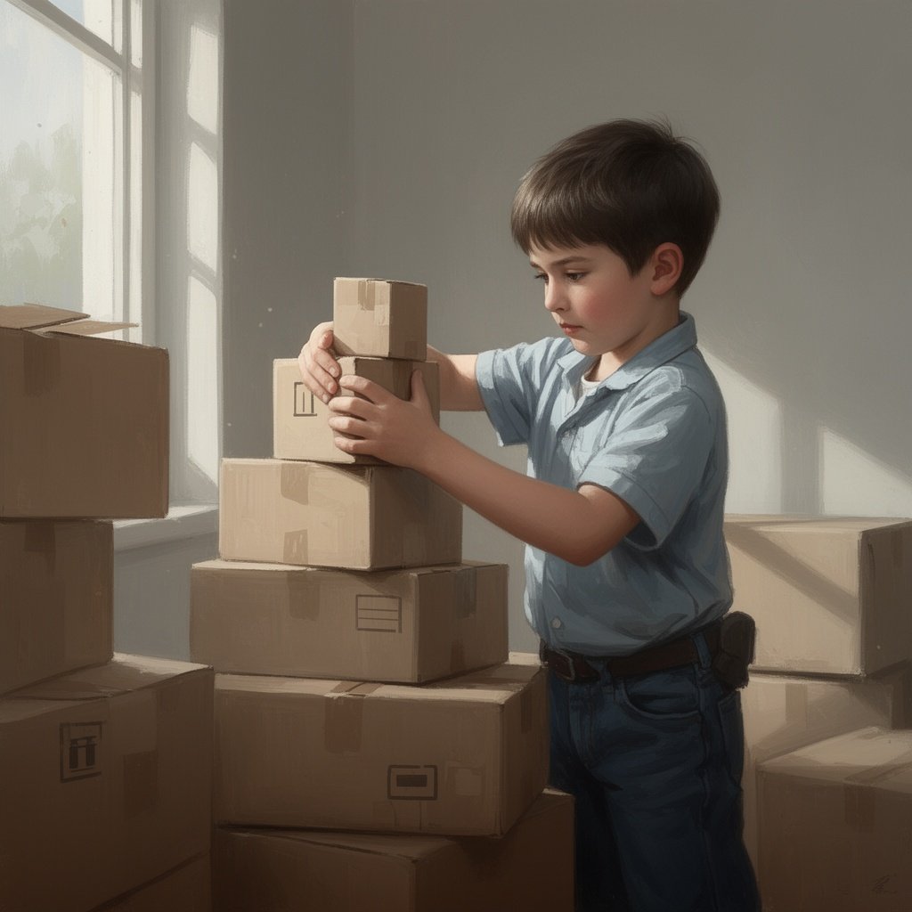 A boy with brown hair wearing a white collar T-shirt, brown pants, and brown shoes