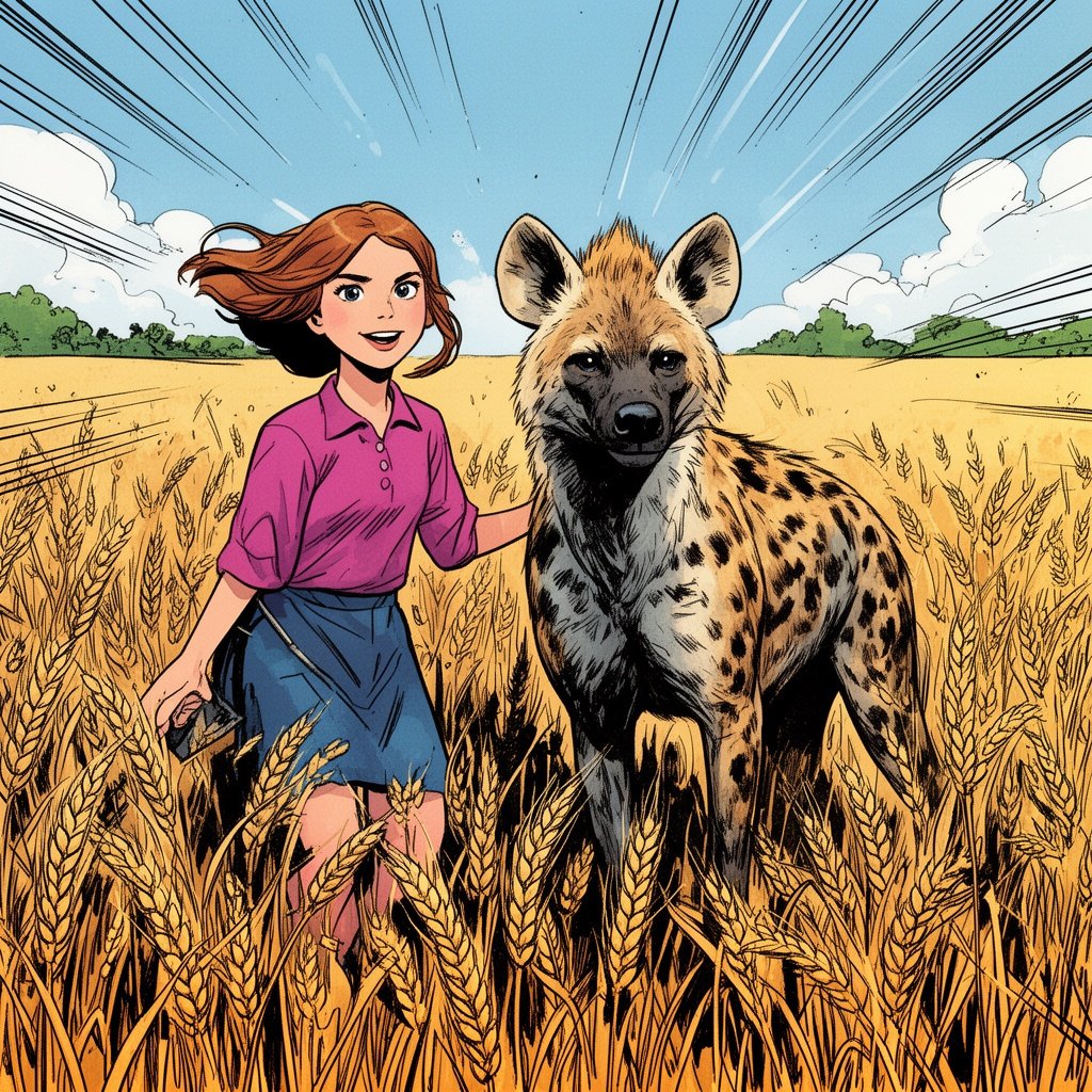 A girl and a hyena standing in a wheat field