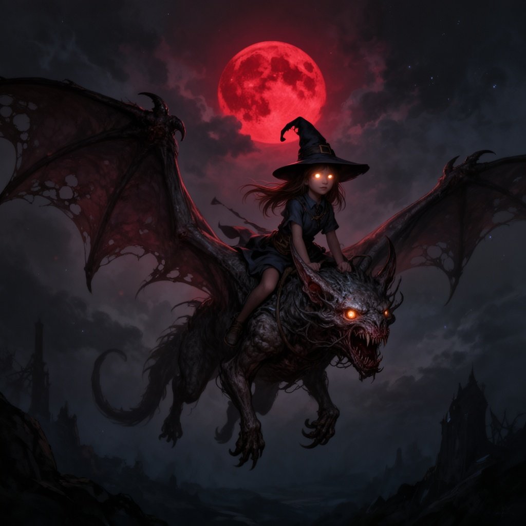 A griffin-dragon hybrid flying through a cloudy sky with a mountain in the distance