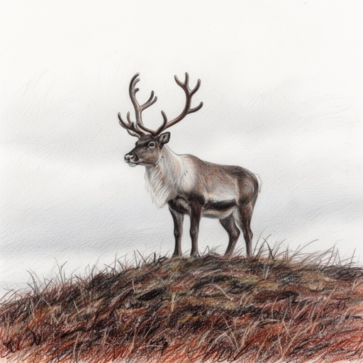 A reindeer standing on top of a hill with dead grass under an overcast sky