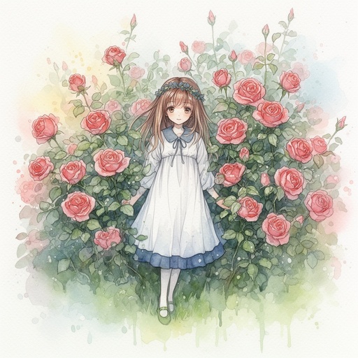 A girl with a pink flower in her purple hair and cute, expressive eyes wearing a sleeveless, multicolored dress that rea...